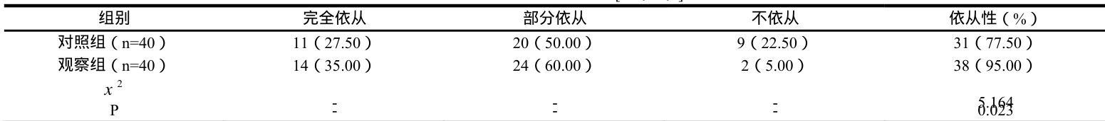 对照组常规护理,根据疾病相关标准展开护理,主要内容包括:住院期间病情监测(呼吸功能、感染指标等);基础护理(氧疗指导、排痰护理、饮食建议);短期健康教育(疾病知识、用药方法讲解);出院前简单指导(复诊时间、紧急情况处理)。观察组延续护理,(1)建立个性化健康档案:患者出院前,责任护士联合医生全面评估其基本信息(年龄、性别、文化程度等)、疾病情况(病程、肺功能分级等)、治疗方案及生活习惯,建立电子健康档案。档案实时更新出院后随访、病情变化及依从性表现,为个性化护理提供依据。(2)多维度随访指导:电话随访:出院 1 周内首次随访,之后每周 1 次持续 1 个月,1 个月后每 2 周 1 次至 3 个月。随访内容包括用药、呼吸功能锻炼、症状变化及生活方式调整情况,对依从性差者分析原因并针对性指导。家庭访视:针对年龄大、行动不便、依从性极差或病情不稳定患者,出院 2 周内首次访视,后续每 1-2 个月 1 次。现场检查用药、指导呼吸功能锻炼、评估居住环境,并强调家属监督支持的重要性。线上随访:通过微信、护理APP 建群,每日推送疾病知识与依从性重要性内容,每周发布呼吸功能锻炼视频,患者可随时咨询,护士24 小时内回复。(3)疾病知识与自我管理培训:出院前集中培训:出院前 1-2 天组织专题讲座,讲解慢阻肺病因、治疗目标及长期治疗必要性,强调依从性对病情控制的作用,分享成功案例提升患者信心。个性化指导:依据患者文化程度与理解能力,用通俗方式一对一指导,如为文化程度低者制作“用药时间表”“锻炼打卡表”,为担心药物副作用者详解应对措施。(4)心理护理与社会支持:关注患者情绪变化,倾听诉求给予情感支持,情绪问题严重者联合心理医生远程疏导。鼓励家属、朋友提供帮助,患者加入互助小组,让其在交流中获支持激励,增强治疗主动性。