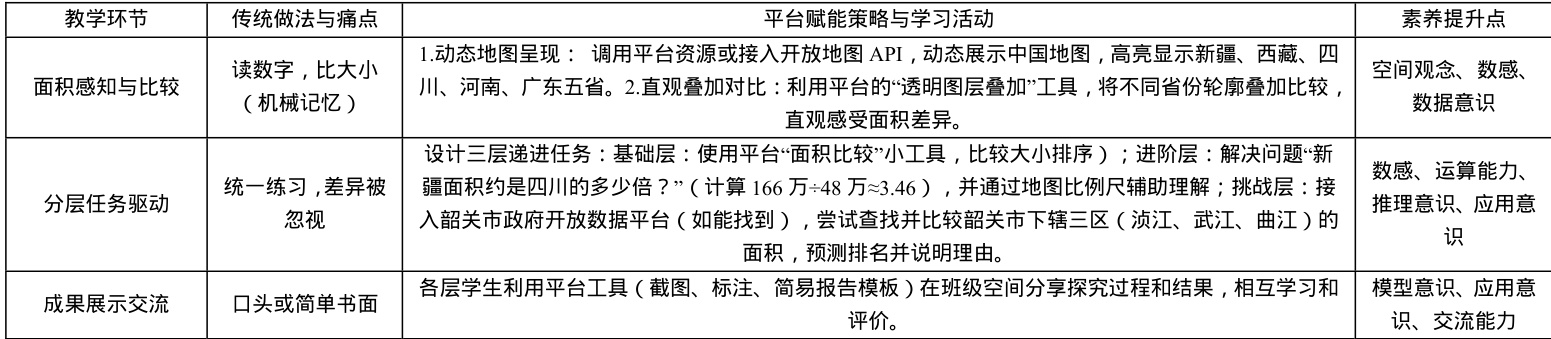 策略二:智能工具支撑深度实践,锤炼问题解决能力。教学中可借助平台交互式智能工具(如 GeoGebra AR/3D 等),设计“做中学”项目任务链。以《国土面积》教学为例,传统教学数字仅是符号,学生空间感知差且任务单一。平台赋能实践:
