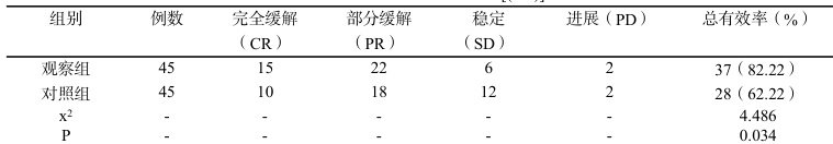 ①治疗效果:根据WHO 实体瘤疗效评价标准,分为完全缓解(CR)、部分缓解(PR)、稳定(SD)和进展(PD)。总有效率 Σ=Σ ( CR+PR. )/总例数 ×100% 。②副作用发生情况:包括恶心呕吐、脱发、骨髓抑制、肝肾功能损害、心脏毒性等。③护理满意度:采用自行设计的护理满意度调查问卷对两组患者的护理满意度进行调查。问卷内容包括护理服务态度、护理技术水平、护理措施落实情况等,共20 个条目,每个条目采用非常满意、满意、不满意三级评分。护理满意度 Σ=Σ (非常满意+满意)/总例数 Φ×100% 。