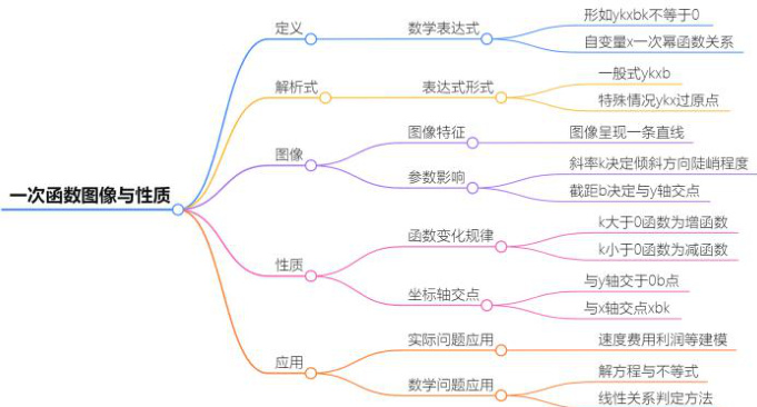 在学习一次函数的教学中,思维导图的价值尤为突出。教师可以以“一次函数”为中心绘制导图,向外延伸出定义、解析式、图像、性质和应用等分支。例如,在课堂导入时,教师先展示导图整体框架,让学生形成全局认知,知道本单元的学习内容包括函数的基本定义、解析式的特征、直线图像的绘制方法、斜率与截距的作用以及函数在实际生活中的应用。在知识讲解过程中,教师可结合导图逐步展开,如在讲解“图像”时,将“直线”“斜率决定倾斜程度”“截距决定位置”等节点依次补充进导图,学生不仅能直观理解一次函数图像的变化规律,还能把握各知识点之间的逻辑关系。在总结阶段,教师则可以让学生自主绘制思维导图,例如以“性质”为分支,归纳出“ k>0 时函数增,k<0 时函数减”等结论,再延伸到“交点”的判定方法。这种方式能帮助学生由表及里地梳理知识结构,实现从零散学习到系统学习的转变。通过小组合作绘制导图,学生还能在讨论与表达中加深对一次函数概念和性质的理解,形成更具条理性和整体性的知识框架。由此可见,思维导图不仅是一次函数知识的直观呈现工具,更是促进学生主动建构、深度学习与协作探究的重要手段。