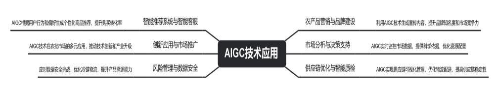 AIGC 技术作为人工智能领域的重要分支,凭借其强大的生成能力和智能分析功能,为农食产业的创新发展提供了有力支持。通过AIGC 技术,可以实现农产品的精准营销、供应链优化、质量追溯等功能,从而提升整个产业链的效率和效益。在淄博农批市场,AIGC 技术的应用已经取得了一定的实践成果,为市场的数字化转型和智能化升级奠定了基础。
