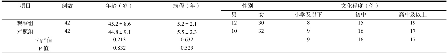 选取 2024 年 5 月—2025 年 5 月在我院就诊的 84 例RA 患者,采用随机数字表法分为观察组和对照组,每组 42 例。两组患者一般资料比较,差异无统计学意义(P>0.05),具有可比性,见表 1。