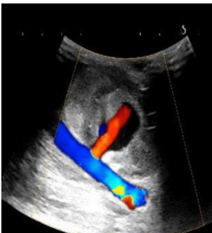 图 1.肱动脉旁假性动脉瘤 彩色多普勒超声可见动脉壁缺损处朝向瘤体的高速喷射血流