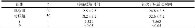 观察组疼痛缓解时间、首次下床活动时间均短于对照组,差异有统计学意义(P<0.05)。见表2。