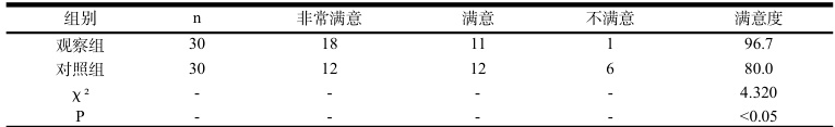 观察组患者对护理的满意度为 96.7% ,高于对照组的 80.0% ,差异有统计学意义(P<0.05)。见表3。