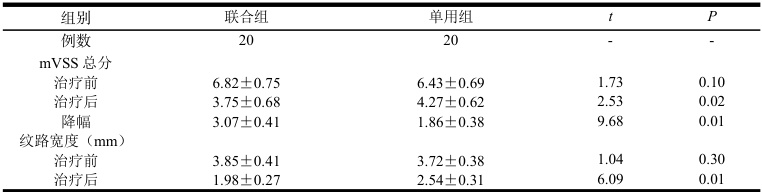 在干预前,两组患者的mVSS 总分以及纹路宽度差异无统计学意义( (P>0.05) 。在接受干预之后,两组患者的mVSS 总分以及纹路宽度均明显下降,且联合组患者的 mVSS 总分降幅以及纹路宽度的所效率均显著大于单用组,数值差异有统计学意义( ⋅⋅P<0.05∣ 。详细数据对比见表1。