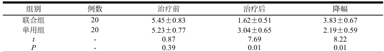 治疗前两组患者的VAS 评分差异无统计学意义( P>0.05) 在接受干预之后两组患者的VAS 评分均显著下降且联合组降幅明显更高,差异有统计学意义( 'P<0.05 )。详细数值见表2。