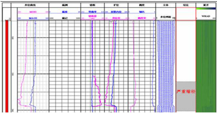 井径测井是目前检测套变的最常用方法。井径测井是利用测井中所测得的多条井径曲线,计算出最大井径、最小井径及平均井径,以此来检查套管状况,并可以根据井径曲线,形成井周成像展开图,便于直接观察。利用记录的多条井径数据,把井径数据按照井周顺序插值计算,求出其井周的均匀的井径数据列,然后利用这些数据以彩色图形式显示出来,同时计算出每一深度点的最大值、最小值及平均值。通过对每一深度点进行数据的量化,数据套用到规律公式中,从而得出直观解释图像。