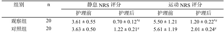 护理后,观察组在静息、运动状态下的NRS 评分比对照组更低( P<0.05 )。见表