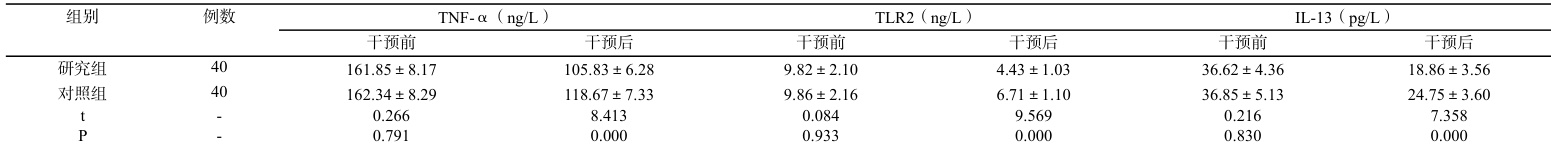 (2)对比两组患者治疗后炎性因子水平,包括肿瘤坏死因子α(TNF-α)、Toll 样受体 2(TLR2)以及白细胞介素13(IL-13)。