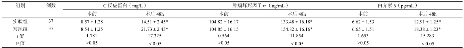 实验组术后48h 炎症指标均低于对照组,见表1。