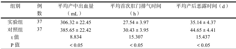实验组37 例采取连续锁边缝合产妇年龄范围20 岁 ~41 岁、均值( 35.66±1.44 )岁。分娩时孕周36 周~42 周、均值( 38.06±1.43 )周。体重 54.54kg~78.43kg 、均值( 63.54±1.47 ) kg 。对照组 37例采取传统连续间断缝合产妇年龄范围20 岁~40 岁、均值( 35.62±1.42 )岁。分娩时孕周35 周~42周、均值( 38.04±1.41 )周。体重 54.51kg~78.41kg 、均值( 63.51±1.44 ) kg 。统计学比较两组采取不同子宫切口缝合方法的剖宫产手术患者一般资料析无显著差异(P 值均大于 0.05 )。