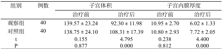 临床疗效。显效:症状显著缓解,子宫体积明显缩小;有效:症状减轻,子宫体积有所减小;无效:与以上标准不符。(2)疼痛程度及月经量。通过疼痛程度数字评估量表(NRS)和失血量图形分析评分法(PBAC)评价,分数与疼痛程度、月经量呈正相关。(3)子宫内膜容受性。子宫体积和子宫内膜厚度。(4)不良反应发生率。