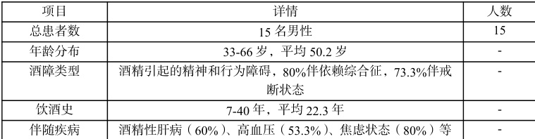 15 名男性患者年龄 33-66 岁,平均饮酒史22.3 年,均确诊为酒精引起的精神和行为障碍,伴随多种慢性疾病(如酒精性肝病、高血压、焦虑等)。