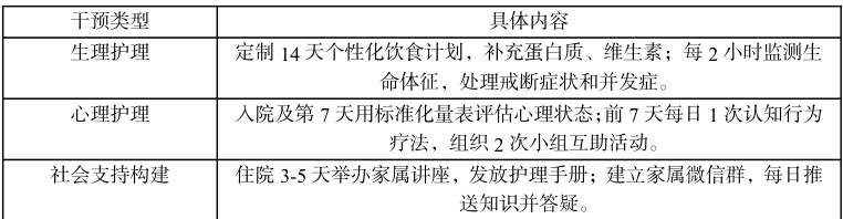 中期(4-10 天):每 2 小时记录戒断症状,结合药物和心理支持缓解不适;每日 1 次认知行为疗法, 70% 患者戒酒信心提升;家属参与度高,计划每 3 天优化 1 次。