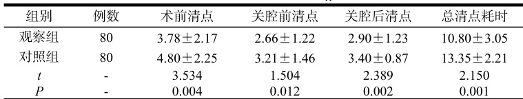观察组手术室物品清点准确率为 100% (80/80),对照组为 91.25% (73/80),观察组手术室物品清点准确率显著高于对照组( χ2=2.416 , P=0.002 )。