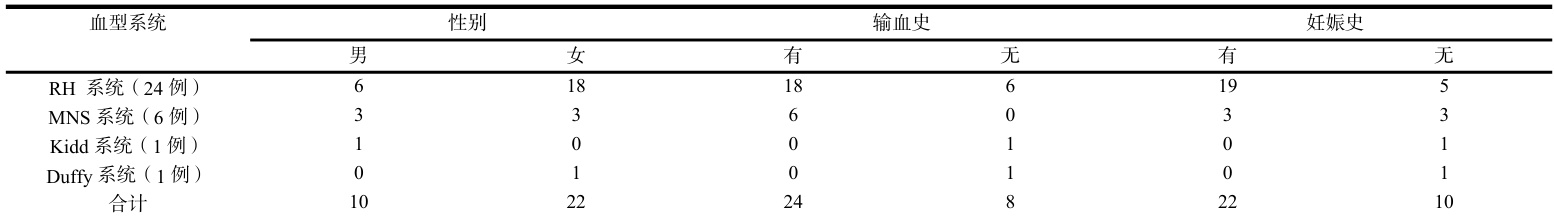 经分析输血治疗者红细胞不规则抗体检验结果可知,RH 系统抗体为主要检出类型(24 例),检出为 75.00% ,其次为 MNS 系统抗体(6 例),检出率为 18.75% ,Kidd、Duffy 系统抗体(各 1 例),检出率均为 3.13‰ 且检出不规则抗体者以女性为主,占比为 68.75% ,伴单一既往妊娠史者 6 例( 18.75% ),伴单一既往输血史者8 例( 25.00% ),伴既往输血史合并妊娠史者 16 例( 50.00% ),无既往输血、妊娠史者2 例( 6.25% )。详见表 1。