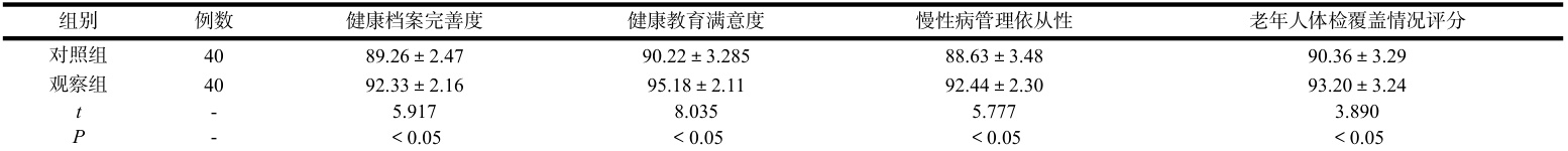 两组居民的公共卫生管理效果对比,对照组健康档案完善度、健康教育满意度、慢性病管理依从性、老年人体检覆盖情况评分较观察组低( P<0.05 ),见表 1。