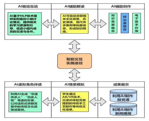 实践方式:以党报中关于传承中华传统文化相关文章为例,学生通过以下方式与AI 实施智能交互:1.AI 辅助解读党报中的传统文化内容,形成知识网络。2.AI 基于自然语言处理(NLP)技术提供可以实时监控小组讨论情况,提供相关的学习资源和引导。3.AI 虚拟角色伴读与情景模拟。4.AI 辅助创作与成果展示。