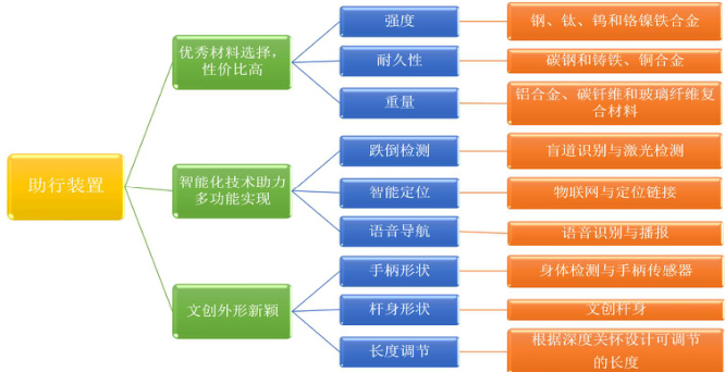 随着全球人口老龄化加剧与残障人群出行需求提升,辅助行走装置已成为改善特殊群体生活质量的关键产品。根据联合国关于人口老龄化的标准界定,60 岁及以上人口占总人口的 10% 以上或 65 岁及以上人口达到总人口的 7% 以上,一个国家或地区便步入老龄化社会行列。截至 2022 年末,我国总人口达到 1.41175 亿人,其中 65 岁及以上老年人口为 20978 万人。这一数据不仅映射出我国人口结构的重大变迁,也是对社会保障体系的挑战。通过以上分析可以明显看出,我国正面临养老领域的重大挑战,并且老年人用品行业的发展跟不上老年人口总量的增长。现有市场上仍存在着许多问题,如产品类别细化程度不够,产品安全质量没有保证,产品市场定位不够清晰等[1]。通过调研,传统助行装置仅能满足基础居家支撑,在户外复杂路况、康复训练场景适应性差;现有智能拐杖虽集成定位、摔倒报警等功能,但存在功能碎片化、缺乏场景化模式切换、特殊场景覆盖不足,例如康复机构适配、公共场所导航缺失、操作复杂等局限[2]。在此背景下,研发“多功能整合、多人群适配、多场景覆盖”的复合型智能辅助行走装置,成为解决当前助行产品发展的核心方向。