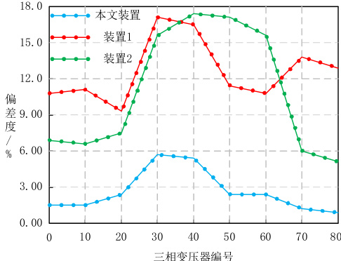 在测试三相智能回路装置的测试性能时,以测试结果与实际结果的偏差度为评价指标,对比三种测试装置的测试性能。三种测试装置的测试结果如图 1 所示。
