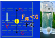 下沉时,浮力小于重力(如图 3);悬浮和漂浮时,浮力等于重力(如图4)。