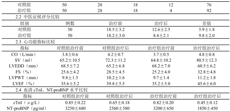 临床总疗效: 按照《中药新药临床研究指导原则》所规定的疗效评价准则,把治疗效果划分成显效、有效以及无效这三个层级。“显效”是指心力衰竭有关的症状基本上消失,而且心功能的改善达到Ⅱ级或者更高;“有效”表示心衰的症状有明显的改善,并且心功能至少改善了Ⅰ级;“无效”则是指心衰的症状没有得到改善,甚至变得更严重,而且心功能也没有明显的改善或者下降。“总有效率”的计算公式是(显效病例数量+有效病例数量)/总病例数量 ×100% 。中医证候评分依照《中医心病诊断疗效标准与用药规范》,针对胸闷、气短、心悸、乏力以及水肿这些主要症状,用无、轻、中、重这四个等级来进行量化评定,各个等级对应的分数分别是0、2、4 和6 分,在治疗前后各做一次评定,以此来反映变化情况。心功能指标: 本研究采用彩色多普勒超声心动图技术,对研究对象进行心排血量(CO)、每搏输出量(SV)、左心室舒张末期内径(LVEDD)、左室短轴缩短率(FS)、左室舒张期后壁厚度(LVPWT)及左心室射血分数(LVEF)的检测,在干预前、后各检测一次。采集受试者治疗前后空腹静脉血3mL,离心分离后取血清,采用化学发光免疫分析法检测血清中cTnI 及 NT-proBNP浓度的变化情况。
