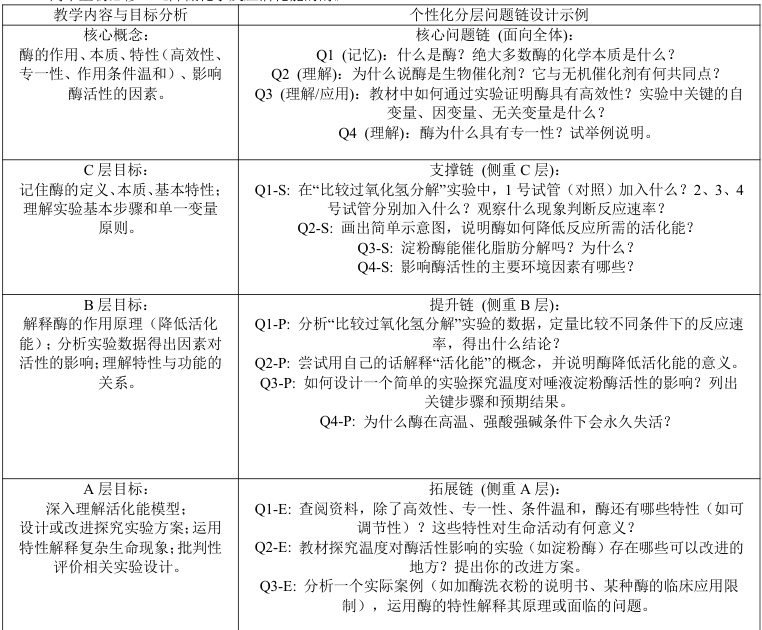 1、目标分层:为不同层次的学生设定清晰、可达成的学习目标(如基础性目标、发展性目标、挑战性目标)。2、内容分层:问题链的核心主干一致,但问题的具体表述、信息提示量、开放程度、思维深度、关联情境复杂度等应根据学生层次进行差异化设计。