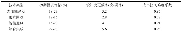 绿色建筑项目中多种环保技术集成导致造价管理复杂性增加,传统造价预算方法难以量化技术间成本耦合效应,据37 个项目调研数据显示绿 使初期投资平均增加 15-25% ,设计变更频率比传统建筑高出 42% ,多技术系统接口复杂性加剧成本控制难度,项目管理者面临技术选择与成本平衡双重挑战,造价管理必须建立精细化成本分析体系应对技术集成不确定性风险(见表1)