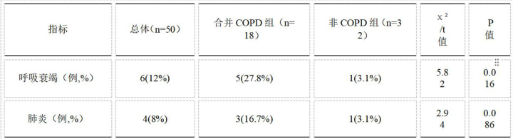 抢救成功率为 94%(47/50),平均症状缓解时间为 (3.2±1.1) )天;呼吸衰竭 (12% ,6/50)与肺炎 (8% ,4/50)为主要并发症。组间比较显示,合并COPD 患者并发症发生率显著高于非COPD 组( x2=5.82 ,P=0.016)。表1重症哮喘患者并发症分布及组间比较