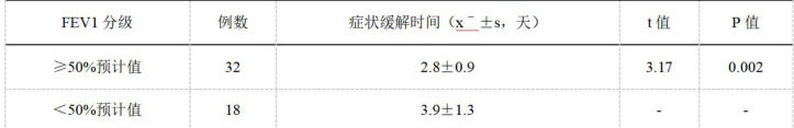 多因素 Logistic 回归显示,基线 FEV < 50%预计值(OR=3.42,95%CI1.08-10.83)与合并 COPD(OR=4.15,95%CI1.22-14.11)为预后不良的独立危险因素(均 P<0.05)。FEV1 ∣⩾ 50%组症状缓解时间显著短于 FEV1<5 0%组(t=3.17,P=0.002)。