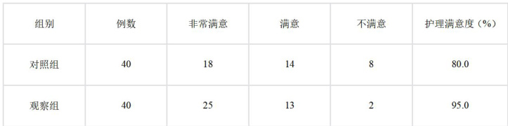 护理满意度观察组患者的护理满意度为 95.0% (38/40),高于对照组的 80.0% (32/40),差异有统计学意义 (P<0.05) )。具体数据见表 2: