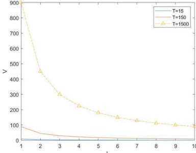 图6 供应链中断风险吸收量V 随特征路径长度工变化而变化的图像