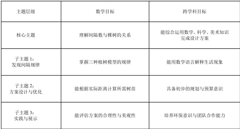 跨学科主题学习的设计应立足于真实、开放且具有生成性的问题情境,激发学生的学习兴趣与探究动机。《植树问题》作为小学数学中一类典型的模型问题,不仅涵盖间隔、对应、规律等数学核心概念,更与生活中的绿化建设、活动策划、资源分配等实际问题密切相关。