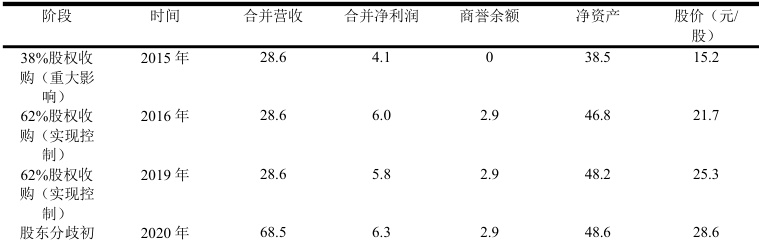 原38%股权重新计量:按2016 年5 月购买日公允价值重新计量,原账面价值3.8 亿元与公允价值的差额1.9亿元计入当期“投资收益”,直接推高2016 年合并净利润1.9 亿元;
