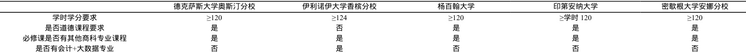 2022 年 US News 公布的美国本科会计专业前五名的学校分别是德克萨斯大学奥斯汀分校、伊利诺伊香槟分校、杨百翰大学、印第安纳大学和密歇根大学安娜堡分校。以德克萨斯大学奥斯汀分校为例,德克萨斯大学奥斯汀分校的工商管理学士(会计专业)需修满 120 学时,包括 42 学时的核心课程,旨在提升写作、定量推理、文化认知及道德能力。尽管该校会计本科全美排名第一,但其课程设置未能充分融合智能化与数字化转型内容,与科技管理系和信息系统管理专业的协同不足。2021-2022 年就业数据显示,会计毕业生平均年薪 72,857 美元,主要流向公共会计和咨询行业。课程体系仍需加强跨学科整合以适应技术变革需求。