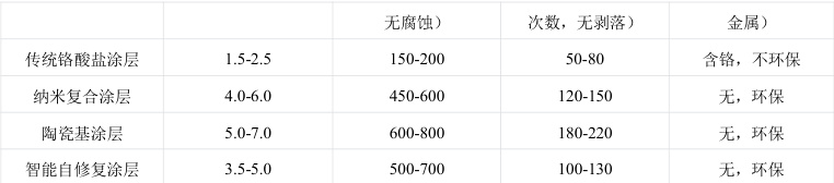 为客观评价新型涂层技术的优势,本文从附着力、耐盐雾性、耐高低温性、环保性四个核心指标,将三类新型涂层与传统铬酸盐涂层进行对比,具体数据如下表所示(数据来源于行业标准测试与公开文献):