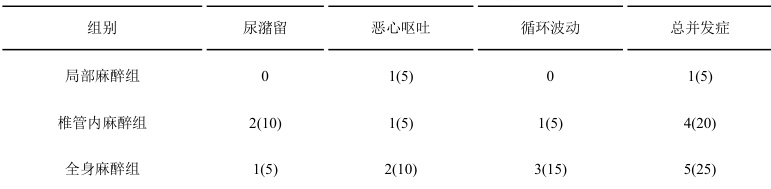 全身麻醉组并发症总发生率最高 (25% , X2=6.7,p=0.035 ),以循环波动( (15%) 为主;椎管内麻醉组尿潴留发生率显著(10%vs 局部麻醉组 0% , x2=4.1,p=0.043) 。局部麻醉组无严重并发症。