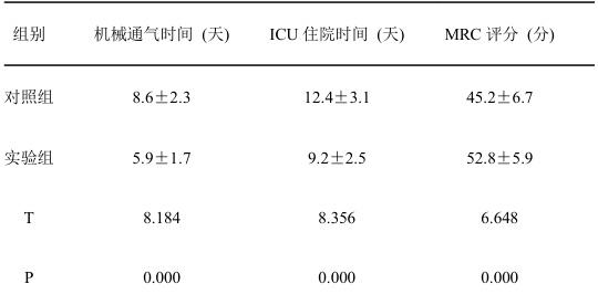 比较两组机械通气时间、ICU 住院时间及肌力恢复评分(MRC 评分)。