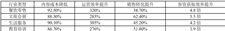 数据表明,文旅会展行业在销售转化方面表现最为突出,因为其体验性特征更容易通过 UGC 内容引发消费策;而餐饮零售行业在成本降低方面效果最显著, 的营销内容需求得到了极大满足。