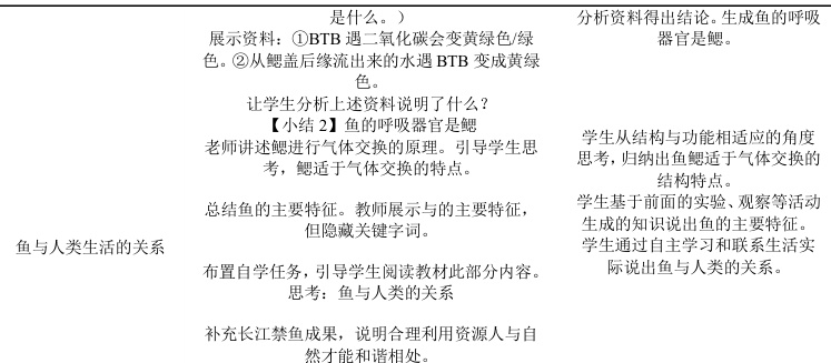 一节课 40 十分钟,在有限的时间里要想突出重点内容就要有取舍。所以在主干知识外的内容都以师生共同学习的形式完成。通过设计三个主要的学生课堂实践活动,即观察鱼的运用、实验鱼的呼吸、自主学习与人类的关系,串联起本节课的主要内容。为什么要选择这三个教学策略来实现目标呢?