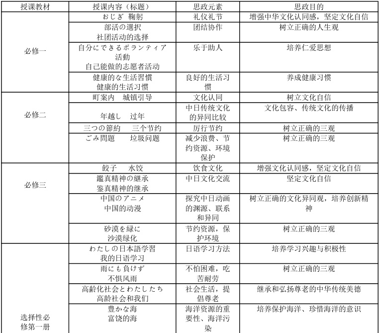 每一位教师都肩负着学生思想政治教育的责任,每一门课程都包含着其特有的思政教育价值。高中日语作为近几年兴起的高中外语科目,作为英语的平行学科,其课程思政教学的重要性和紧迫性不言而喻。很多学生一提到日本会说“小日本”、提到日本人会说“日本鬼子”,暂且不论此类称呼是否恰当。但其中隐含的对日厌恶或仇视情结,是毋庸置疑的。学生们此类情感的形成,无疑源于日本的侵华历史。对于实施或多或少有民族“过节”的“敏感”课程,笔者认为更应注重思政教育。因此,在日语课程实施过程中,以专业知识为载体,有意识地加强思政理念与元素的渗透,明确思想品德的引领性,培育学生正确的家国情怀、爱国意识、文化鉴赏能力与文化意识,增强思辨性,消除偏见,理性地看待中日文化以及两国关系,显得尤为重要。
