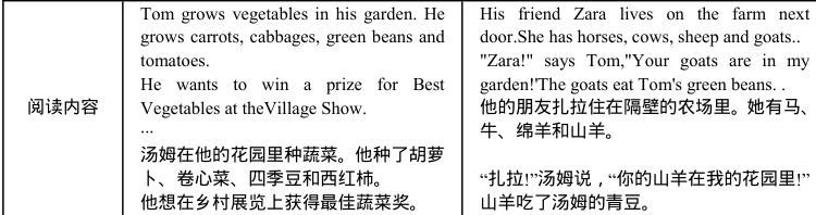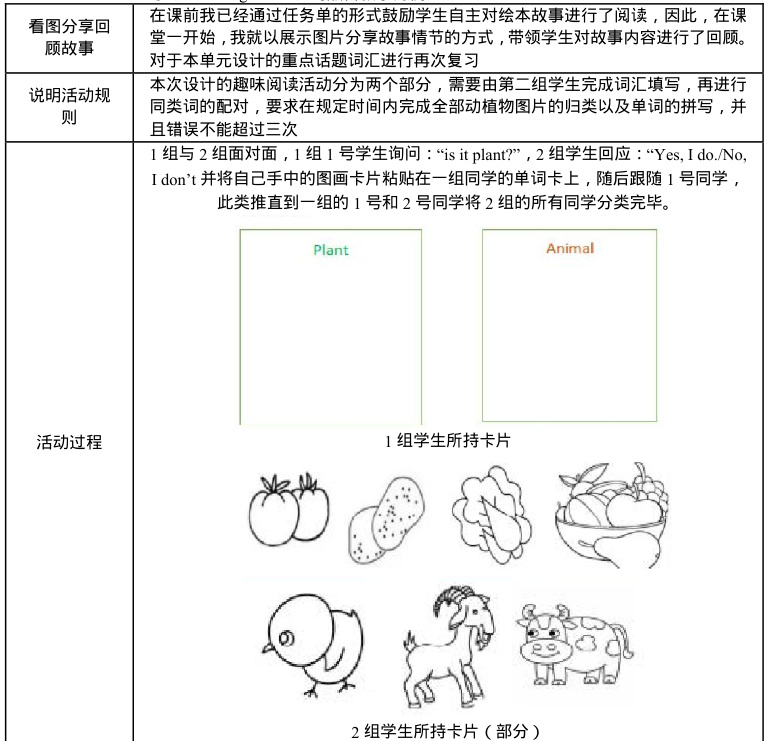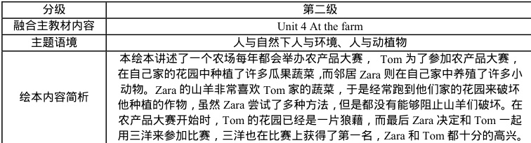 英语学科的主题语境主要分为了人与自我,人与社会,以及人与自然三个维度,而每个纬度又细化为了多个分支。因此,教师在基于分级绘本为学生设计阅读活动时,就必须立足于教材本身的主题语境,选择恰当的配套绘本内容来对课堂教学进行有效的支持,拓展教学内容的同时,帮助学生围绕主题语句构建结构化的知识体系。因此,笔者在为学生开展四年级下册 Unit 4 At the farm 这一板块的阅读教学时,我就为学生选择了《丽声北极星分级阅读绘本》、第二级第4 篇 {≤ssgtr 村比赛》,并结合绘本设计了《农场中的同类》趣味阅读活动。
