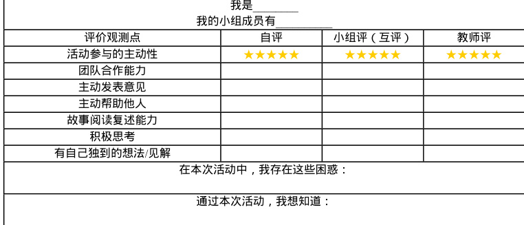 而为了进一步反馈学生实际的学习效果,教材需要设计相匹配的评价量表来对学生的活动过程进行评价,评价方式包括学生自评,小组互评,教师评价等。以下是我为学生设计的小组评价表。