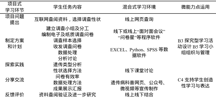 人教版高中生物学教材包含丰富的项目式学习资源,可结合具体教学内容,搭配适当的微能力点,构建混合式学习环境,发展学生科学探究素养。如《调查人群中的遗传病》,本调查实验能帮助学生深刻理解不同类型遗传的特点,还与 STS 相关联,能让学生了解遗传咨询师这一职业属性,与社会责任相关联全面发展学生核心素养。但在传统课堂教学中,由于需要投入大量课外时间,且调查周期长,往往被忽略,埋没了社会责任素养价值。混合式学习线上+线下的灵活学习时间和学习空间特点可有效解决这一问题。