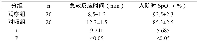 观察组急救反应时间短于对照组,入院时 SpO2 高于对照组,差异均有统计学意义( P<0.05) 。见表1。