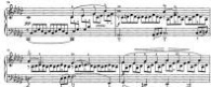 作品以一个简单的旋律线开始,后半部分则以悠扬的主题为主。调性的转变将曲目的情感转向紧张,出现了大量的装饰音和颤音,因而丰富了作品的层次。此外,作品中和声色彩也十分丰富。例如: