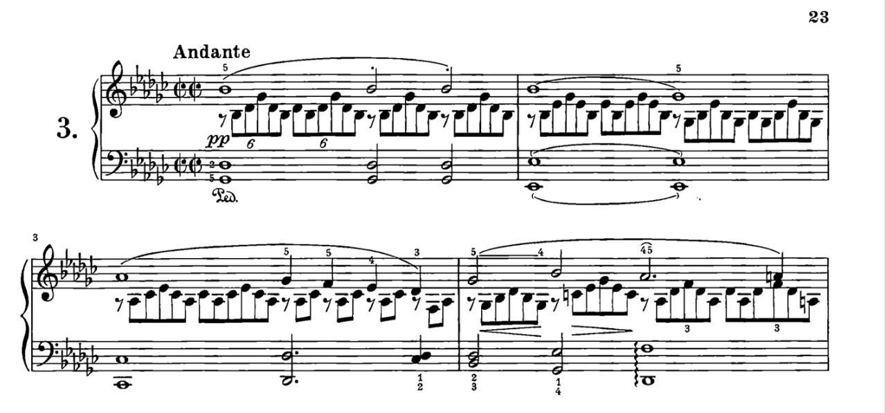 舒伯特的作品里,踏板的使用是一个值得琢磨的问题。舒伯特的创作融合了古典主义与浪漫主义的音乐征,这使得踏板的使用既要遵循一定的规则,又要能够灵活变通,以适应作品中丰富的情感与色彩变化。3 在换踏板时,我们需要以遵循干净且辅助旋律流动为目的,灵活调整踏板的使用。