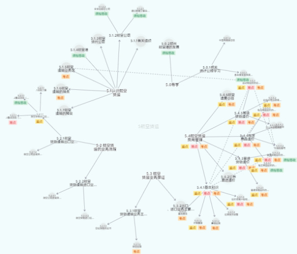 经过以上准备后,将模板表格导入平台自动生成知识图谱。图1 是以“5 航空货运”章内容生成的图谱,图谱结构清晰结构清晰、脉络分明,“重点”、“难点”、“考点”、“课程思政”表达清楚,节点间关联清晰,能有效支撑物流运输管理课程“两性一度”教学目标的达成。