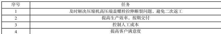 由表 1 可知,压缩机端盖螺栓拉伸断裂失效分析及改善项目任务较为繁重,不仅需要高效完成压缩机高压端盖螺栓螺纹处拉伸断裂改善作业,而且需要控制人工成本,避免二次返工,获得客户的认可。